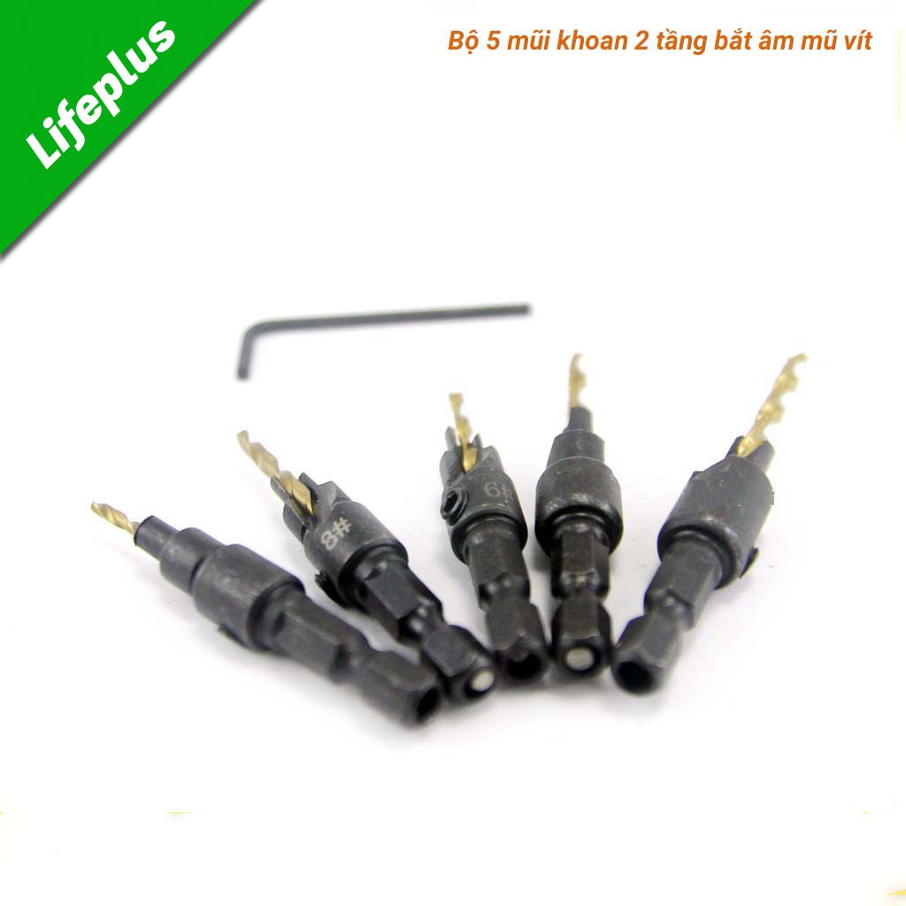 Bộ 5 mũi khoan 2 tầng chỉnh cữ bắt âm mũ vít 2-3.55mm khoan gỗ nhôm đồng chuôi lục giác