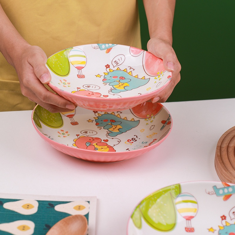 Bộ bát đĩa ăn cơm, chén ăn cơm, bát đựng ngũ cốc bằng sứ hoạ tiết khủng long hồng dễ thương cho bé.