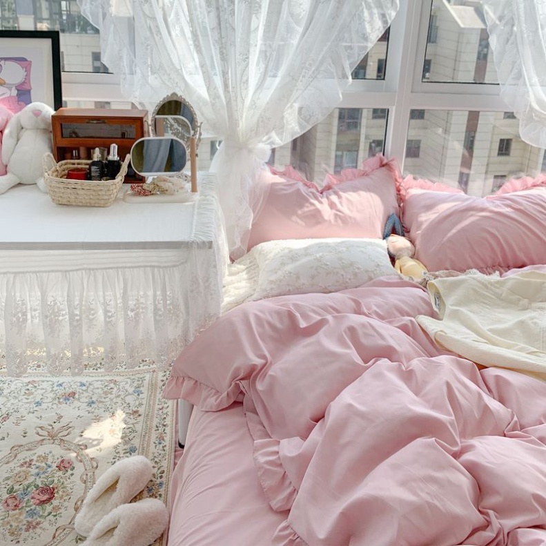 Bộ chăn ga gối Cotton tici viền bèo đáng yêu drap giường Hàn quốc ga trải bo chun đủ size - Màu Hồng phấn viền bèo