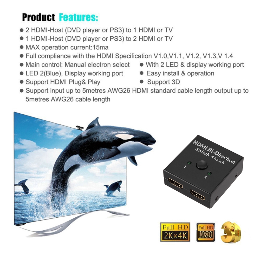 Thời gian giao hàng dự kiến cho sản phẩm này là từ 7-9 ngày Bộ chia tín hiệu 2 cổng HDMI 4K 2K tiện lợi Đặc điểm: 1. 2 máy chủ HDMI (cho đầu đĩa DVD hoặc cho PS3) sang 1 HDMI hoặc màn hình TV 2. 1 máy chủ HDMI (cho đầu DVD hoặc cho PS3) sang 2 HDMI hoặc màn hình TV 3