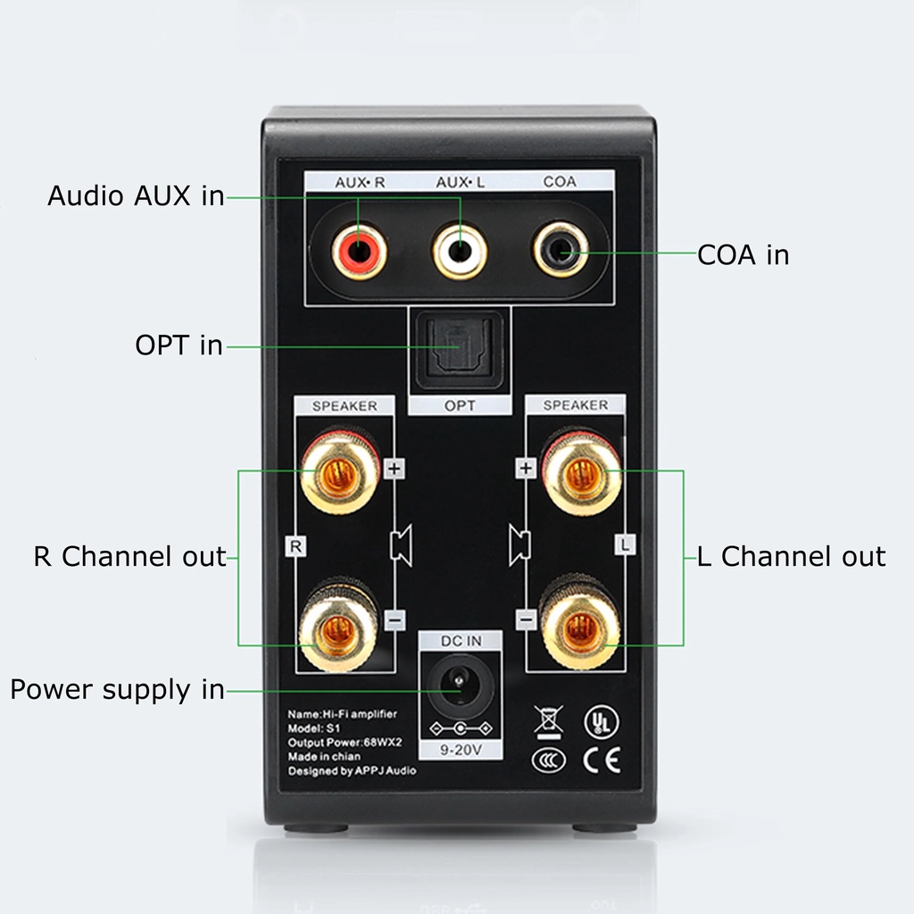 Mẹo: Nguồn điện PHẢI là 9V-20V / lớn hơn 3.5A, nếu bạn không có nguồn điện phù hợp, có thể mua chung nguồn điện. Đặc điểm: 1.Bluetooth 5.0 Truyền không mất Tín hiệu ổn định, khoảng cách truyền dài (lên đến 12m), tương thích thông minh với 99% thiết bị Các thiết bị đầu cuối mạ vàng bằng đồng nguyên chất để tăng độ ổn định và độ chính xác của tín hiệu truyền âm thanh 2.Kích thước phù hợp và ngoại hình hấp dẫn Kích thước nhỏ gọn phù hợp với sử dụng rất tốt cho gia đình và máy tính để bàn. Không chỉ là bộ khuếch đại công suất mà còn có thể làm card âm thanh PC. Vỏ nhựa tích hợp với màn hình LED, thiết kế độc đáo làm cho nó mịn và có kết cấu. Không có vít nhìn thấy trên bề mặt để đảm bảo độ chắc chắn và sạch sẽ của nó, đồng hồ VU sẽ nhảy theo âm nhạc, đẹp và thiết thực. 3. Đa chức năng và hiệu suất tuyệt vời Hỗ trợ nhiều đầu vào (AUX / USB / Bluetooth / Optical / COAXIAL in). Cổng USB hỗ trợ cả hai máy tính (không cần trình điều khiển) và điện thoại (có chức năng OTG), Nó có thể cung cấp cho bạn hầu hết mọi phương pháp mà bạn muốn thưởng thức âm nhạc của mình. Nó cung cấp cho bạn trải nghiệm nghe tuyệt vời ngay cả ở mức giá rất thấp, núm âm lượng sử dụng bộ mã hóa đắt tiền thay vì chiết áp thông thường để tránh tiếng ồn khi điều chỉnh âm lượng. 4. Âm thanh Hi-Fi và Mạnh mẽ Âm thanh rõ ràng và rõ ràng HiFi, không gây tiếng ồn, kỹ sư của chúng tôi đã dành nhiều thời gian và công sức để tối ưu hóa mạch để đảm bảo nó không có tiếng ồn ngay cả khi công suất tối đa powe 68W * 2. Thông số sản phẩm Bluetooth: Phiên bản 5.0, khoảng cách 12M Đầu vào âm thanh: AUX 3.5mm, Bluetooth và USB, Optical, Coaxial. Đầu ra âm thanh: Giắc cắm loa chuối Công suất đầu ra: 68W * 2 Trở kháng loa: 4Ω-8Ω Đáp ứng tần số: 20Hz-20KHz (± 1dB) Snr: ≥98dB Nguồn cung cấp: DC9V-20V (có bảo vệ phân cực ngược) Kích thước: (W) 100 * (H) 62 * (D) 113mm (3,93 in * 2,44 in * 4,44 in) Khối lượng tịnh: 360g Gói hàng bao gồm:\ 1 × Bộ khuếch đại 1 × Nguồn điện (Tùy chọn) 1 × Mannul