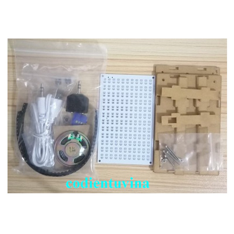 Mạch có chức năng hiển thị hiệu ứng led theo nhạc, điện áp hoạt động 5V phổ biến. Sản phẩm Trọn bộ mạch led nháy theo nhạc - tự ráp bao gồm đầy đủ các phụ kiện , linh kiện, hộp mica, dây cáp, sơ đồ hướng dẫn (quý khách vui lòng xem ảnh bên trên) để quý khách dễ dàng lắp ráp. Trọn bộ sản phẩm bao gồm: Bảng mạch PCB: 1 cái màu trắng Linh kiện: Led dán: 3 màu đỏ - xanh lá - xanh dương Điện trở dán: 10ohm, 100ohm, 20K, 100K Tụ điện dán: 104, 105, 470uF IC: AD8002, 1 vi xử lý Nút nhấn dán Cổng mini USB Loa Dây cáp: cổng mini USB chia 2 đầu USB và audio Hộp mica Lưu ý: Sản phẩm được cung cấp đầy đủ linh kiện và phụ kiện để quý khách tự lắp ráp. Trọn bộ sản phẩm có bao gồm 3 màu led đỏ - xanh lá - xanh dương (số lượng mỗi màu 25 con). Nếu có nhu cầu đổi màu led quý khách vui lòng liên hệ với nhân viên để được tư vấn chi tiết.