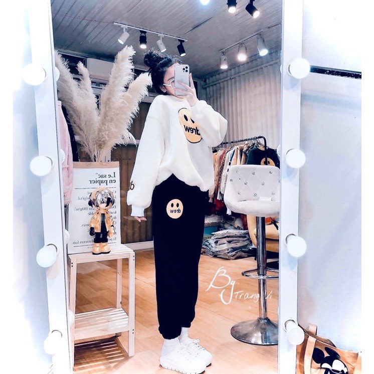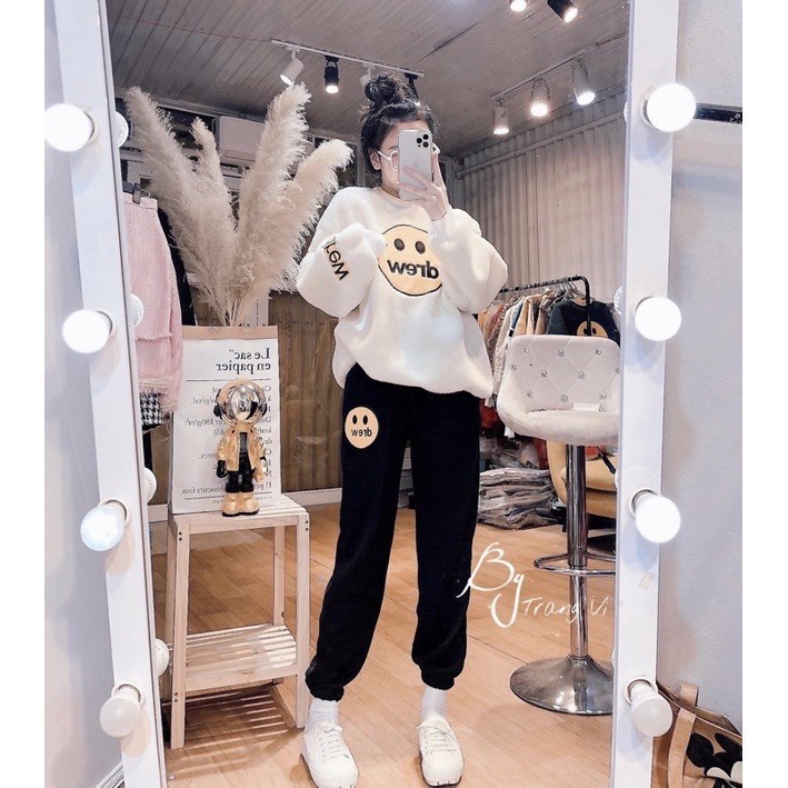 Bộ nỉ in hình mặt cười drew nữ - Set đồ ngủ quần ống bo gấu kèm áo sweater form rộng tay bồng mặc ở nhà đẹp ulzzang