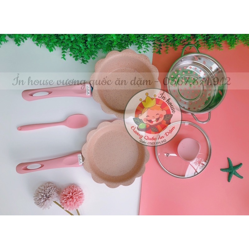 Bộ nồi chảo men đá chống dính, kèm hấp hình bông hoa nấu đồ ăn dặm cho bé dùng được bếp từ-Ỉn House