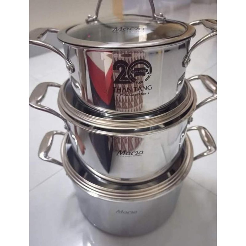 BỘ NỒI INOX 304 ĐA LỚP SUNHOUSE MAMA SHG2020 THIẾT KẾ SANG TRỌNG – TINH TẾ +Sở hữu kết cấu 3 lớp kim loại cao cấp với lớp ngoài cùng bằng inox 430, lớp giữa bằng nhôm và lớp trong cùng bằng inox 304 giúp mang lại cho bộ nồi inox 304 đa lớp SUNHOUSE MAMA SHG2020 độ b