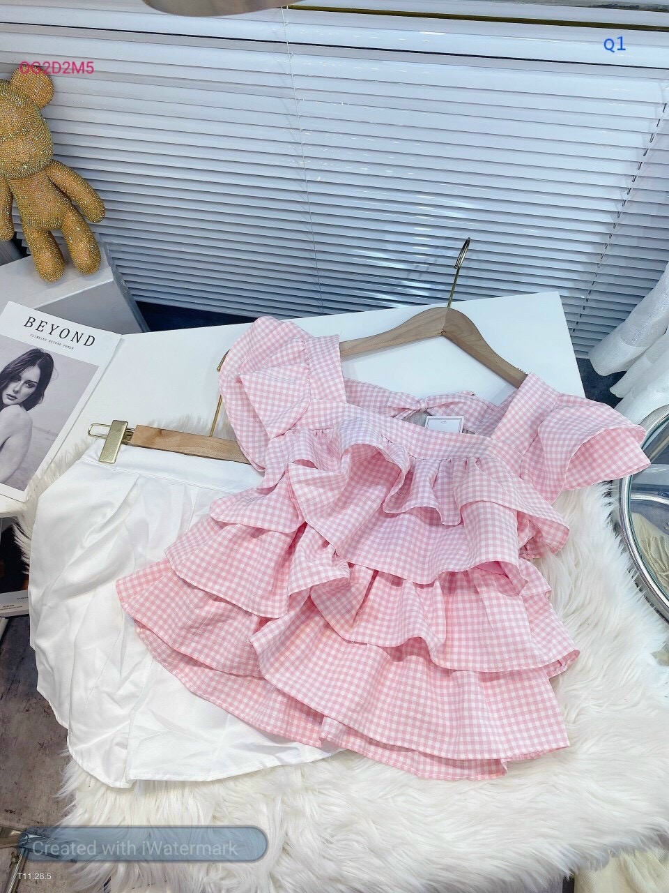 Set bộ đồ nữ caro áo cúp ngực cánh tiên mix quần giả váy xếp ly tầng bèo với tone hồng baby xinh xắn