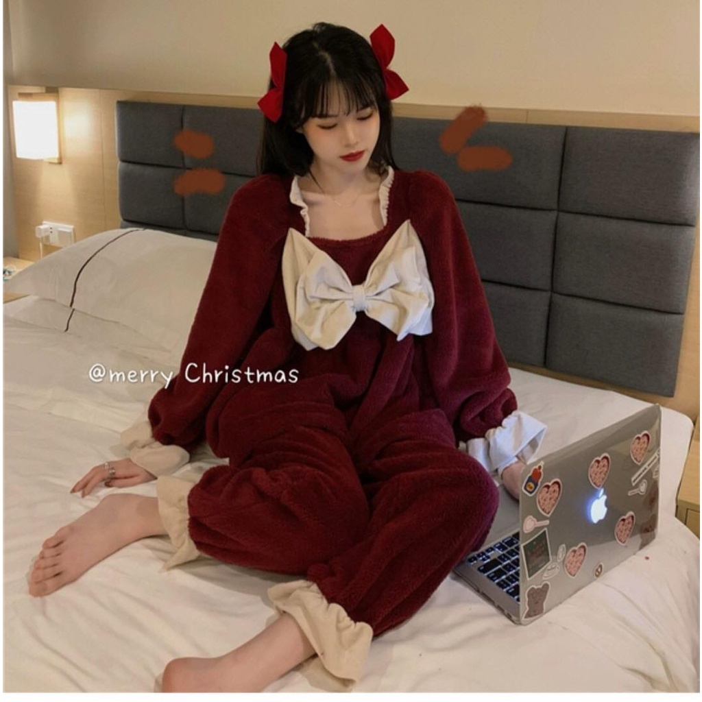 Bộ ngủ nữ nhung phối nơ cực xinh 3 màu/ Bộ mặc nhà dài tay phối nơ mùa đông dễ thương