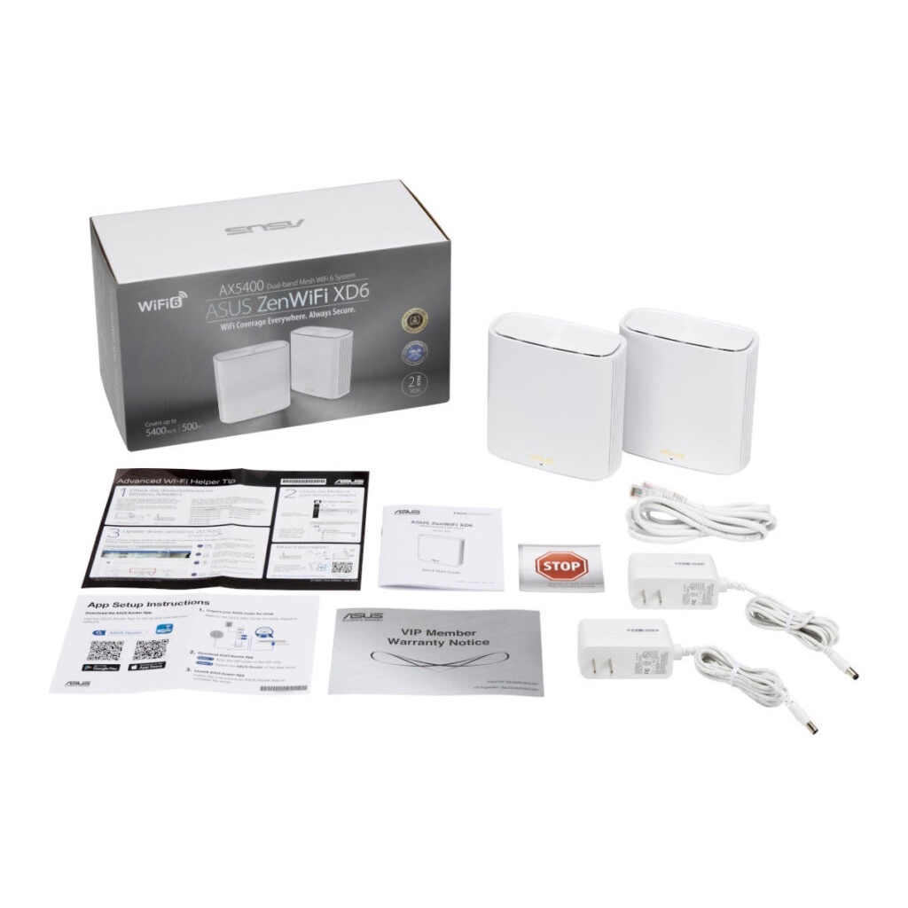 ZenWiFi AX Router ASUS XD6 (W-2-PK) - ZenWiFi AX Router XD6 (1 bộ = 2 chiếc), Mesh Wifi 6, Chuẩn AX5400, AiProtection, Parental Control. - Bao gồm 2 băng tần: 2.4Ghz (574Mbps) + 5GHz (4804Mbps). - 3 port Giga LAN + 1 port Giga WAN. - Flash Nand 256 + RAM 512 MB.