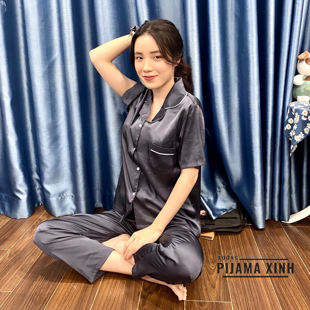 Bộ Pijama Lụa Latin - chất trơn màu xanh than Cao cấp Chất đẹp Đường may chuẩn