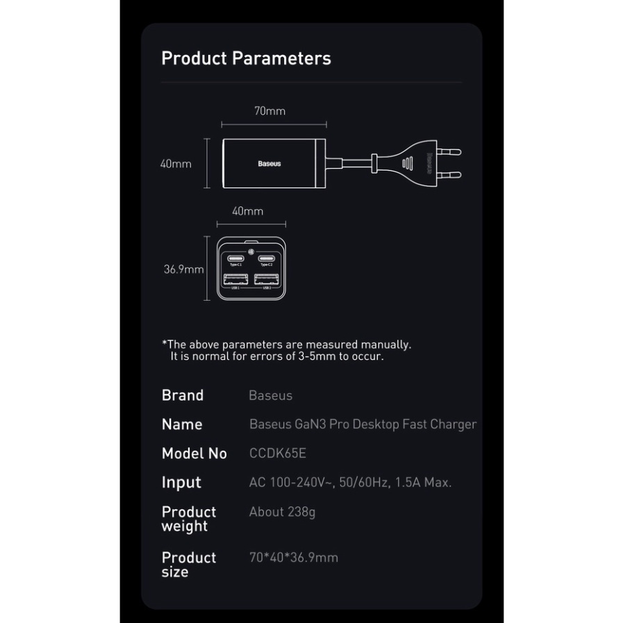 Thời gian giao hàng dự kiến cho sản phẩm này là từ 7-9 ngày Xin chào ~ Chào mừng bạn đến với cửa hàng chính hãng Baseus !!! Vui lòng đọc mô tả sản phẩm cẩn thận và chọn món bạn cần. Hầu hết các sản phẩm đều có sẵn! Chúc bạn một ngày tốt lành ~ ❥ Gói hàng bao gồm: (như hình) ❥ Thông tin chi tiết: Thương hiệu: BASEUS GaN: CÓ Công suất đầu ra tối đa: 65W Chứng nhận chất lượng: ce Giao thức sạc nhanh phù hợp: Sạc nhanh Samsung Giao thức sạc nhanh phù hợp: USB PD Giao thức sạc nhanh phù hợp: Sạc nhanh Qualcomm Giao thức sạc nhanh phù hợp: Sạc nhanh Huawei FCP Giao thức sạc nhanh phù hợp: Sạc nhanh Huawei Xuất xứ: TQ (Xuất xứ) Giao diện đầu ra: 2 cổng A Giao diện đầu ra: 2 cổng C Giao diện đầu ra: USB Giao diện đầu ra: Type C Loại sản phẩm: Để bàn Nguồn điện: Nguồn A.C. Chứng nhận: CE Số model: Sạc nhanh Baseus GaN3 Pro để bàn Sạc thông minh: Có Đầu vào: AC 100-240V, 50 / 60HZ, Tối đa 1.5A Đầu ra Type C 1 / Type C 2: 5V / 3A, 9V / 3A, 12V / 3A, 20V / 3.25A Đầu ra USB 1: 5V / 1A Đầu ra USB 2: 5V / 3A, 9V / 3A, 12V / 3A, 20V / 3A Đầu ra Type C 1 + Type C 2: 45W + 20W Đầu ra Type C 1 + Type 2: 45W + 18W Đầu ra Type C1 / Type C 2 + USB 1: 60W + 5w Đặc điểm 1: Bộ sạc USB, Bộ sạc USB C, Bộ sạc nhanh USB Đặc điểm 2: Bộ sạc GaN, Bộ sạc nhanh GaN, Bộ sạc nhanh Đặc điểm 3: Bộ sạc 65W, Bộ sạc nhanh 65W, Bộ sạc 65W GaN, Bộ sạc nhanh 65W GaN Đặc điểm 4: Bộ sạc PD cho iPhone 13 Pro Max 12 11 XS XR X Đặc điểm 5: Bộ sạc nhanh 65W cho máy tính xách tay Macbook Air Đặc điểm 6: Bộ sạc nhanh cho Samsung Galaxy S21 S20 S10 S8 S9 Đặc điểm 7: Bộ sạc nhanh cho Xiaomi Poco Realme Huawei Đặc điểm 8: Bộ sạc để bàn, Bộ sạc nhanh để bàn Đặc điểm 10: Bộ sạc nhanh GaN USB 4 cổng