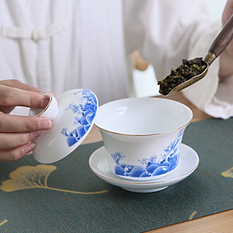 Bộ Tách Uống Trà Bằng Gốm Sứ Có Nắp Đậy Màu Trắng Xanh Dương Phong Cách Kung Fu