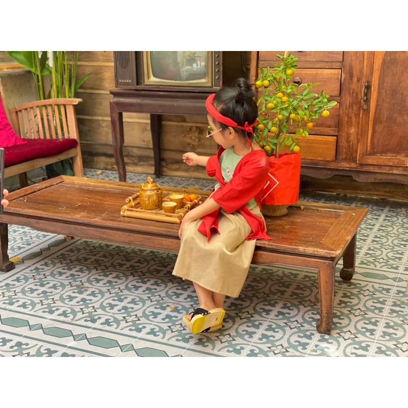 ⚡️⚡️ Ship Hoả Tốc Tp.HCM ạ! 🧨🧨 --- Cô em nhà ai mà trendy quá! 😍😍 Tết truyền thống mà cũng hiện đại bá cháy nhen các mẹ. Tứ thân cách điệu trên chất liệu linen thêu, đảm bao sang xịn mịn. Nguyên set mấn, yếm, áo khoác tứ thân và váy đụp chỉ 210k full set đúng kiểu của nhà em trồng được nên giá bán cũng siêu hạt dẻ so với các shop khác ạ! - 1 set đồ gồm: 1 yếm, 1 áo choàng, 1 váy + 1 mấn cùng màu gới áo choàng - Có 2 màu: Đỏ và Nâu để các con thoả thích hoá thân, biến hoá nhân vật. Khách đã mua qua bà ba và áo dài bên e thì biết dõ nhất luôn. Chất lượng vải và đường may luôn đặt lên hàng đầu. Chất vải thân thiện với làn da bé, mềm mịn mát tay. - Có bán thêm phụ kiện: guốc mộc, giỏ lát ạ! Em có sẵn size từ 1 tới 8 tuổi. 8-35kg (size như bà ba ạ) - chi tiết size như hình đính kèm trên sản phẩm