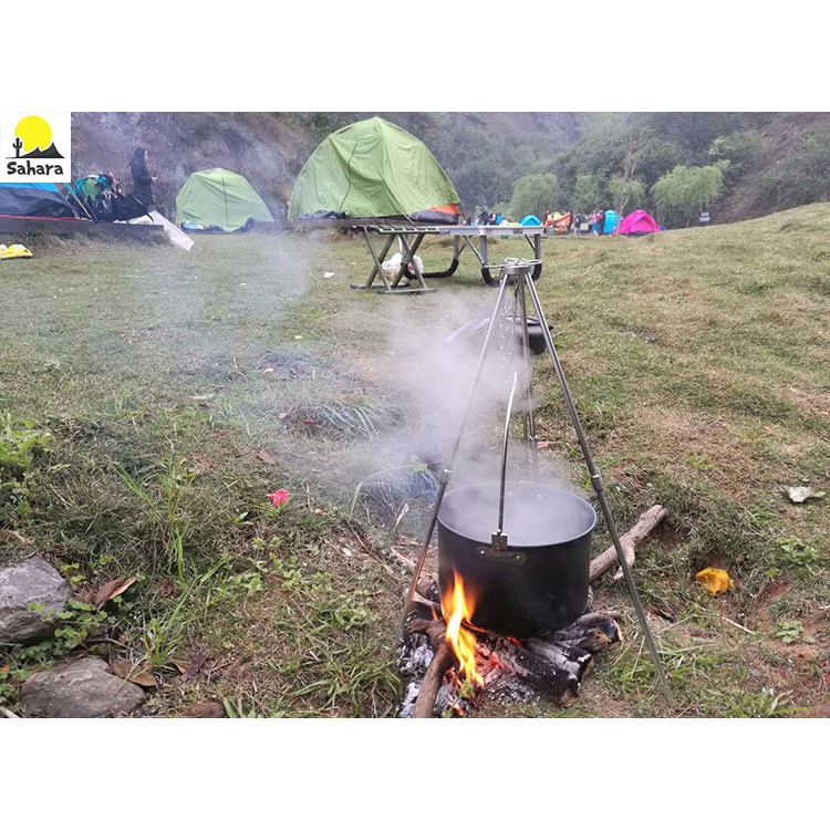 Chân đế treo nồi dã ngoại Trong chuyến đi cắm trại, khi đến nơi, đất đai bằng phẳng, cỏ mọc xanh xanh nhưng xung quanh chẳng có cụm đá, cục đất nào để kê nồi, chảo, điều đó thật bất tiện khi bạn loay hoay tìm kiếm để nấu nướng. Chân đế treo nồi dã ngoại sẽ hỗ trợ để t