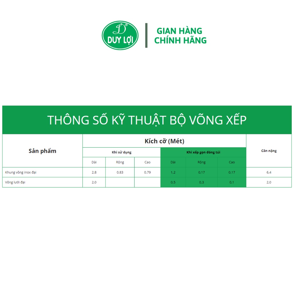 BỘ VÕNG XẾP DUY LỢI INOX CỠ ĐẠI Thương hiệu Duy Lợi Xuất xứ: Việt Nam Địa chỉ nhà máy: CÔNG TY TNHH SX DUY LỢI - Lô 2 đường Tân Tạo, P. Tân Tạo A, Q.Bình Tân, TP.HCM 1 - " Khung + võng +10 móc" - Sản phẩm bao gồm: Khung võng xếp inox cỡ đại Võng lưới đại 20 lỗ d