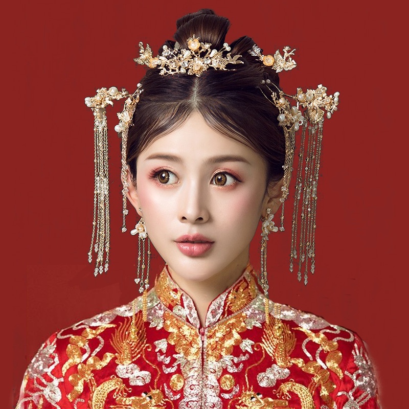 Bộ vương miện và phụ kiện cho cô dâu phối tua rua phong cách Trung Hoa sang trọng