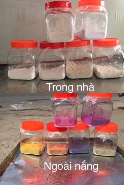 Bột biến quang đổi màu dưới ánh nắng ! Gói 3g : giá 120.000 Có 2 loại : loại 1 trong nhà là trắng ra nắng lên màu có 6 màu như ảnh, loại này khi sơn phủ lên các bề mặt không làm mờ đi màu nền sẵn có. Loại 2 : trong nhà là 1 màu ra nắng đổi thành 1 màu khác có 7 màu nh