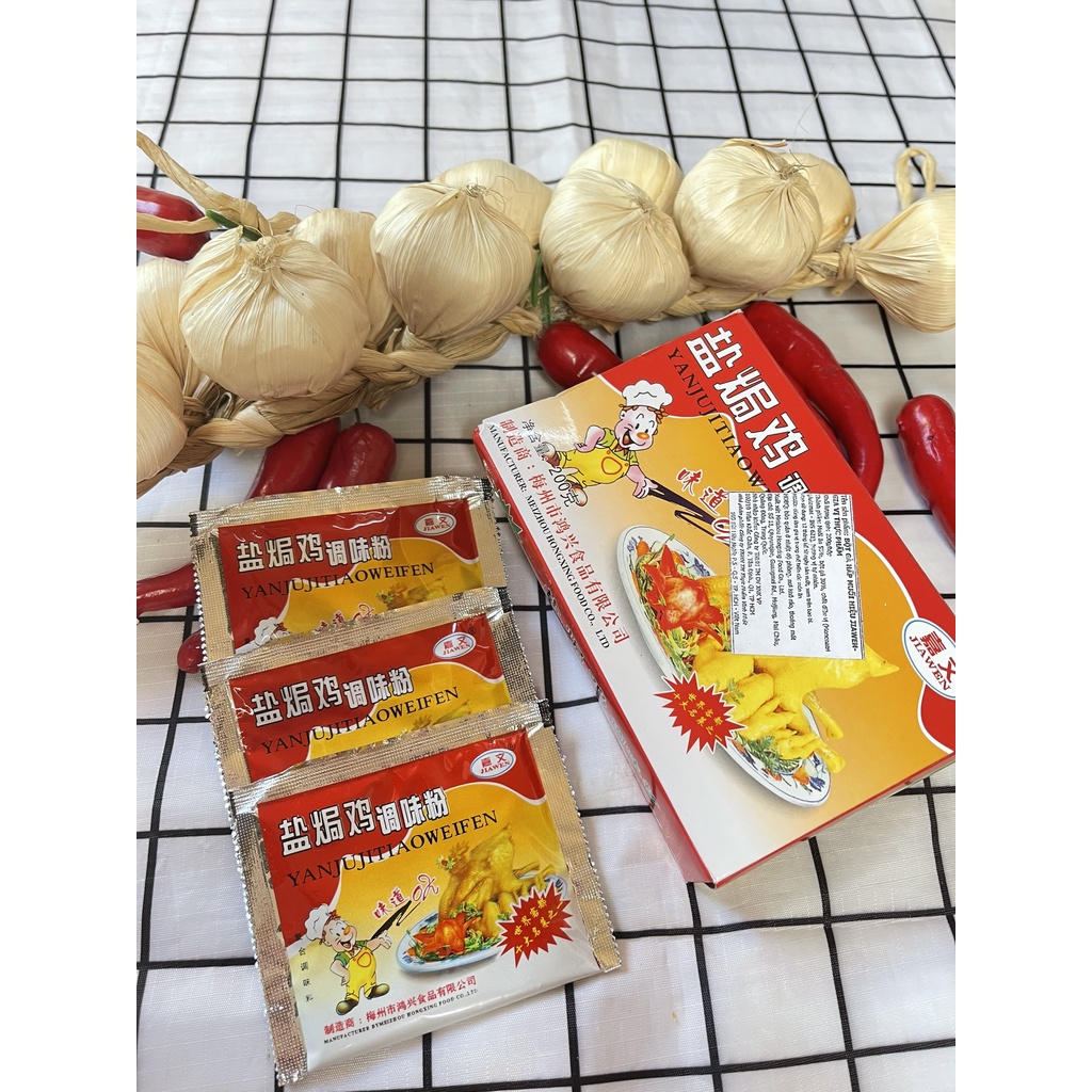 BỘT GÀ HẤP MUỐI HOA TIÊU - BỘT GÀ Ủ MUỐI Thông tin sản phẩm : - Xuất xứ : Trung Quốc - HSD: 12 tháng - Mùi thơm của món gà om muối đến từ các loại hương liệu như: địa liền, bạch chỉ, bạch đậu khấu... - Độ giòn của da gà 1 phần đến từ loại gà già nhưng cũng nhờ có bí q