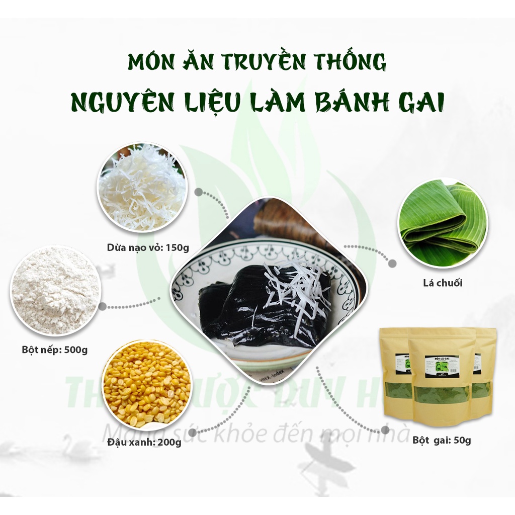 Bột lá gai khô là sản phẩm được làm từ 100% lá gai tươi nguyên chất được chọn lựa kỹ lưỡng, rửa sạch, sấy khô theo công nghệ sấy lạnh hiện đại sau đó được nghiền thành bột lá gai nguyên chất... Bột gai sau khi nấu lên tạo cho vỏ bánh có màu đen bóng, có mùi thơm đặc t