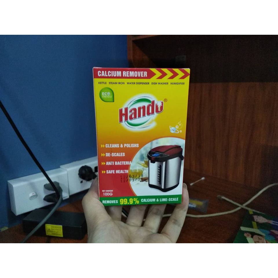Thông tin sản phẩm Tên sản phẩm : Bột tẩy cặn vôi vôi Canxi Hando Công dụng : Ấm đun, phích nước, bàn là, máy rửa bát, phun sương dùng lâu ngày sẽ bị cặn canxi từ nước bám vào tạo nên một lớp cặn trắng như vôi bám ở trong bình chứa hoặc đầu xịt. Khi uống nước cặn can