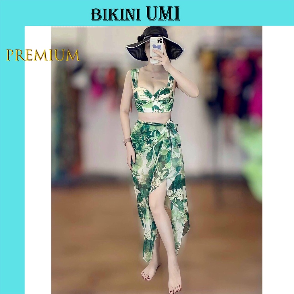 BIKINI 2 MẢNH GỌNG KÈM KHĂN HỌA TIẾT XANH LÁ CỌ SẾP LI CAO CẤP BIKINI UMI