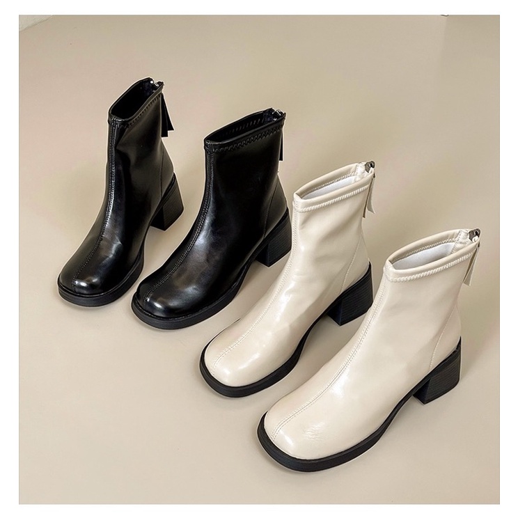 Boots nữ cổ ngắn da mềm ôm chân gót vuông cao 5cm có khoá kéo