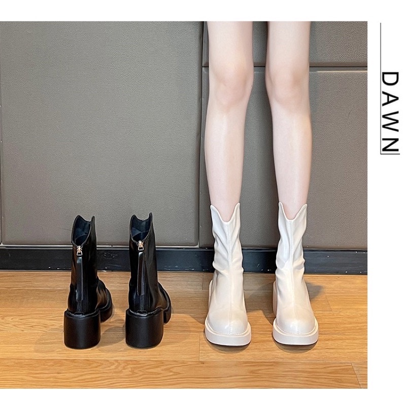 Boots nữ cổ V ngắn gót vuông cao 6cm da mềm ôm chân có khoá kéo