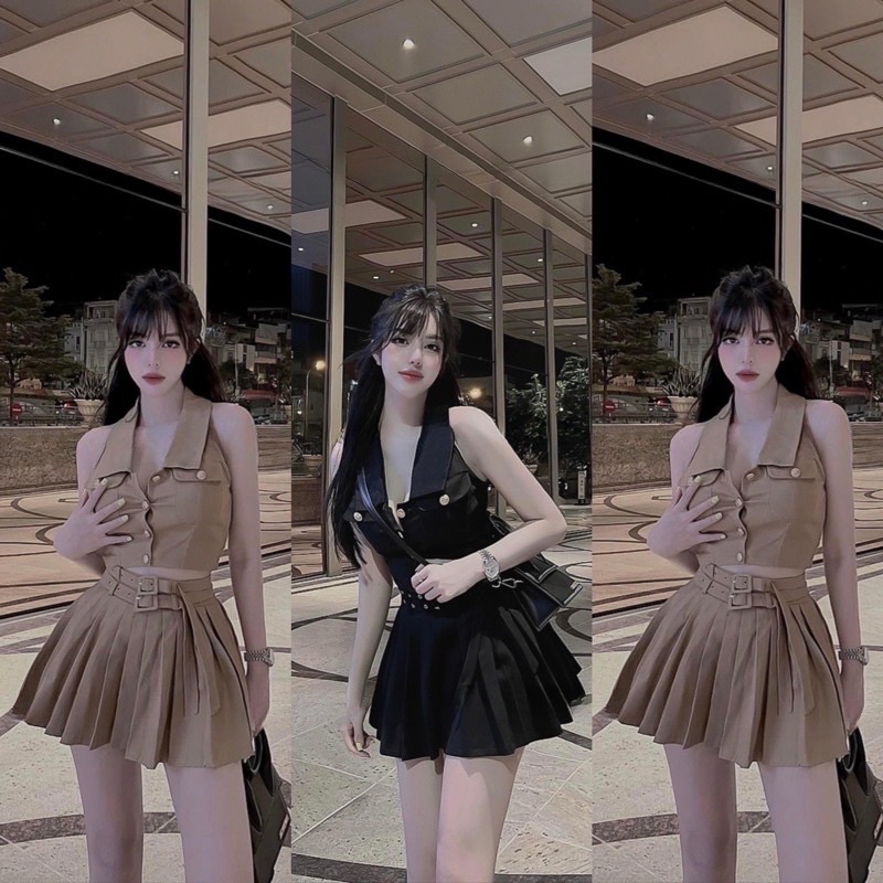 Váy dài cổ vest dáng xoè dài tay có co giãn tặng kèm đai da Lys&Key by Lyslee