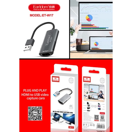 Cáp HDMI to USB 3.0 video capture Earldom ET-W17 - hỗ trợ Live Stream, ghi hình từ điện thoại, Camera, PS4, XBOX