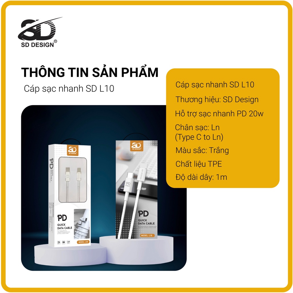 Dây sạc nhanh 20w chính hãng SD Design L10, Cáp sạc ổn định cho điện thoại 6 đến 13 pro max PHỤ KIỆN SD DESIGN - CHUYÊN SỈ LẺ GIÁ GỐC PHỤ KIỆN ĐIỆN THOẠI Sản phẩm cung cấp: Ốp lưng, cường lực, cáp sạc, củ sạc, tai nghe, sạc dự phòng chất lượng hàng đầu... ****** Chín