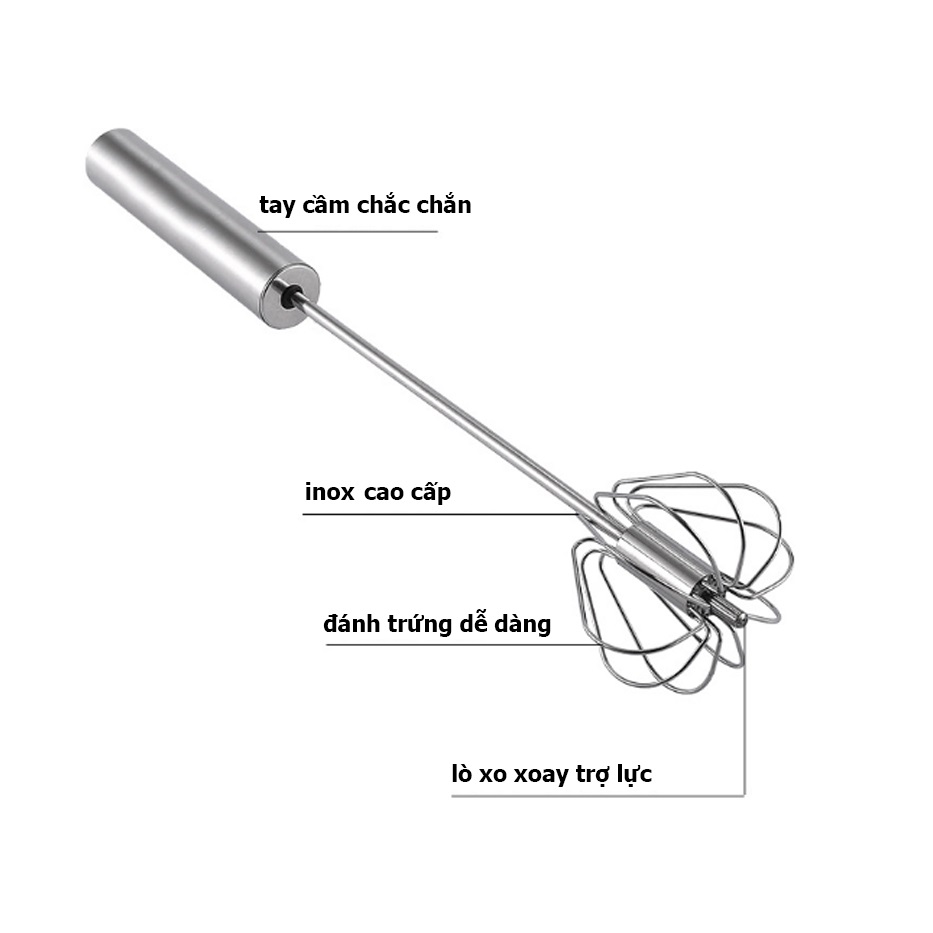 Cuộc sống hiện đại ngày nay, đối với các chị em nội trợ yêu thích làm bánh, làm kem thì dụng cụ đánh trứng là vật dụng không thể thiếu trong nhà bếp. Cây đánh trứng có trục lò xo trợ lực tự xoay thông minh được thiết kế đặc biệt giúp các chị em chế biến các món ăn từ trứng nhanh chóng và tiện lợi hơn. Cây đánh trứng làm bằng inox cao cấp không han gỉ, an toàn cho sức khỏe đạt tiêu chuẩn vệ sinh an toàn vì không gây ảnh hưởng đến chất lượng thực phẩm ngay cả khi tiếp xúc nhiệt độ cao. Với thiết kế tay cầm chắc chắn, cây đánh trứng dễ sử dụng chỉ cần dùng lực ấn xuống và thả ra. Dụng cụ đánh trứng được thiết kế với trục lò xo trợ lực tự xoay thông minh. Chỉ cần dùng lực ấn nhẹ, phần đánh trứng sẽ tự quay nhờ hệ thống lò xo trợ lực được đặt bên trong do vậy không cần dùng điện. Thiết kế gọn nhẹ, sang trọng, dễ sử dụng, dễ dàng vệ sinh, cây đánh trứng phù hợp với tất cả không gian nhà bếp của mỗi gia đình. Thông tin sản phẩm: - Tên sản phẩm: Cây đánh trứng cầm tay tự xoay đa năng - Kích thước: 27 x 7 x 7 cm - Chất liệu: inox - Màu sắc: trắng bạcGiá sản phẩm trên Tiki đã bao gồm thuế theo luật hiện hành. Bên cạnh đó, tuỳ vào loại sản phẩm, hình thức và địa chỉ giao hàng mà có thể phát sinh thêm chi phí khác như phí vận chuyển, phụ phí hàng cồng kềnh, thuế nhập khẩu (đối với đơn hàng giao từ nước ngoài có giá trị trên 1 triệu đồng).....