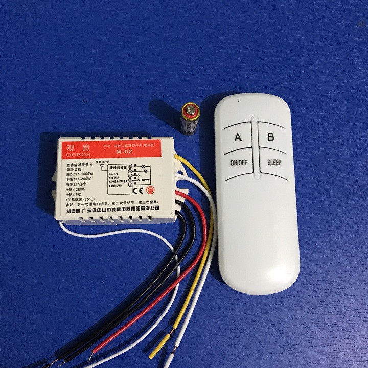 Công tắc điều khiển từ xa rf kèm remote sóng RF 315mhz 2 3 4 kênh Hỗ trợ 2 3 4 kênh (Công tắc). Khoảng cách điều khiển ~20m. Sản phẩm có kèm điều khiển và pin: 12V 23A. Remote có 5 nút (4 nút on/off từng thiết bị và 1 nút ON/OFF toàn bộ). Có kệ đỡ remote có thể bắt vít lên tường. Điện áp hoạt động: 200V - 240V. Công suất max: 1000W. Hướng dẫn lắp đặt - Dây nguồn vào: Dây màu đỏ (Dương) và dây màu đen (âm). - Dây nguồn ra 1: Dây màu xanh dương (Dương) và dây màu đen chung (âm). - Dây nguồn ra 2: Dây màu trắng (Dương) và dây màu đen chung (âm). - Dây nguồn ra 3: Dây màu vàng (Dương) và dây màu đen chung (âm). - Dây nguồn ra 4: Dây màu nâu (Dương) và dây màu đen chung (âm) Và một dây trắng độc lập là dây anten