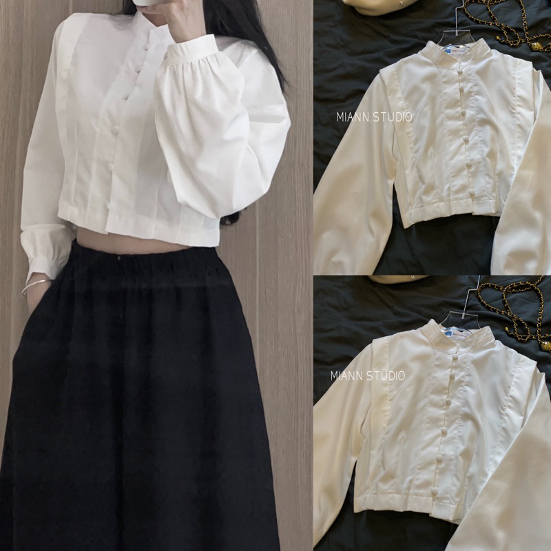 Áo sơ mi trắng cổ vạt cách điệu li ngực cúc bọc đủ size S M L XL huyen hip