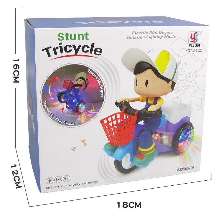 Cậu bé đi xe đạp 3 bánh bốc đầu xe xoay 360 độ có đèn led và nhạc sôi động