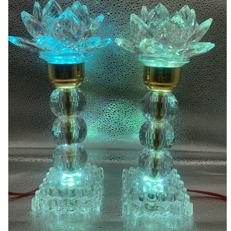 Bộ 2 Đèn Hoa Sen Pha Lê Nguyên Khối Để bàn Thờ Phật Đèn Hoa Sen Đèn Thờ Cúng Cao 28cm