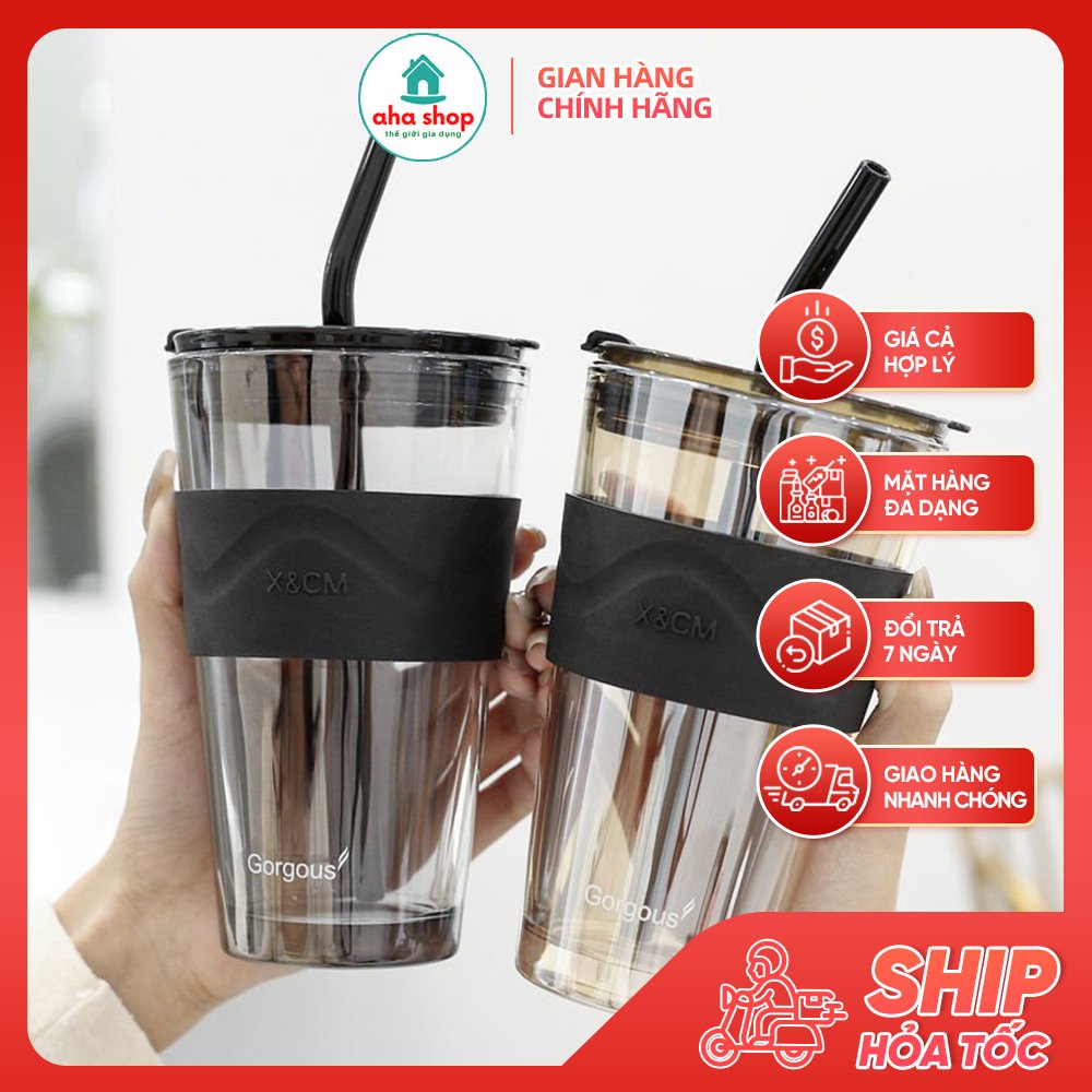 Ly Thủy Tinh Cao, Cốc Thuỷ Tinh 450ml Có Nắp Kèm Ống Hút 2 Màu Hổ Phách, Khói Sang Trọng