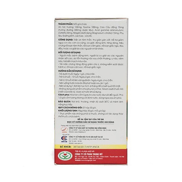 Quy cách Cốm EGARUTA: Hộp 30 gói x 3g Thành phần Cốm EGARUTA: An Tức Hương: 105mg Taurine: 100mg Cao Câu Đằng: 75mg MgCl2: 30mg GABA: 25mg Công dụng Cốm EGARUTA: Hỗ trợ điều trị và phục hồi khả năng vận động của cơ thể sau cơn động kinh. Phòng ngừa và giúp giảm tần suất số lần các cơn co cứng, co giật ở trẻ Liều dùng Cốm EGARUTA: Trẻ dưới 3 tuổi: Ngày uống 2 lần, mỗi lần 1/2 gói Trẻ từ 3 tuổi – 10 tuổi: Ngày uống 2 lần, mỗi lần 1 gói Trẻ từ 10 tuổi trở lên và người lớn: Ngày uống 2 lần, mỗi lần 2 gói Nên uống trước bữa ăn 30 phút hoặc sau khi ăn 60 phút Nên sử dụng liên tục từ 3 – 6 tháng để có kết quả tốt nhất. Không dùng sản phẩm cho phụ nữ có thai *Lưu ý: - Sản phẩm không phải là thuốc và không có chức năng thay thế thuốc chữa bệnh. - Tác dụng của sản phẩm tùy thuộc vào sự hấp thu của từng người.