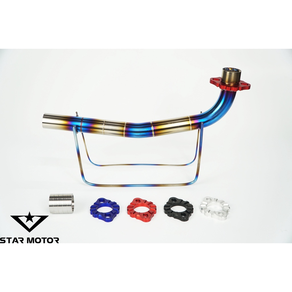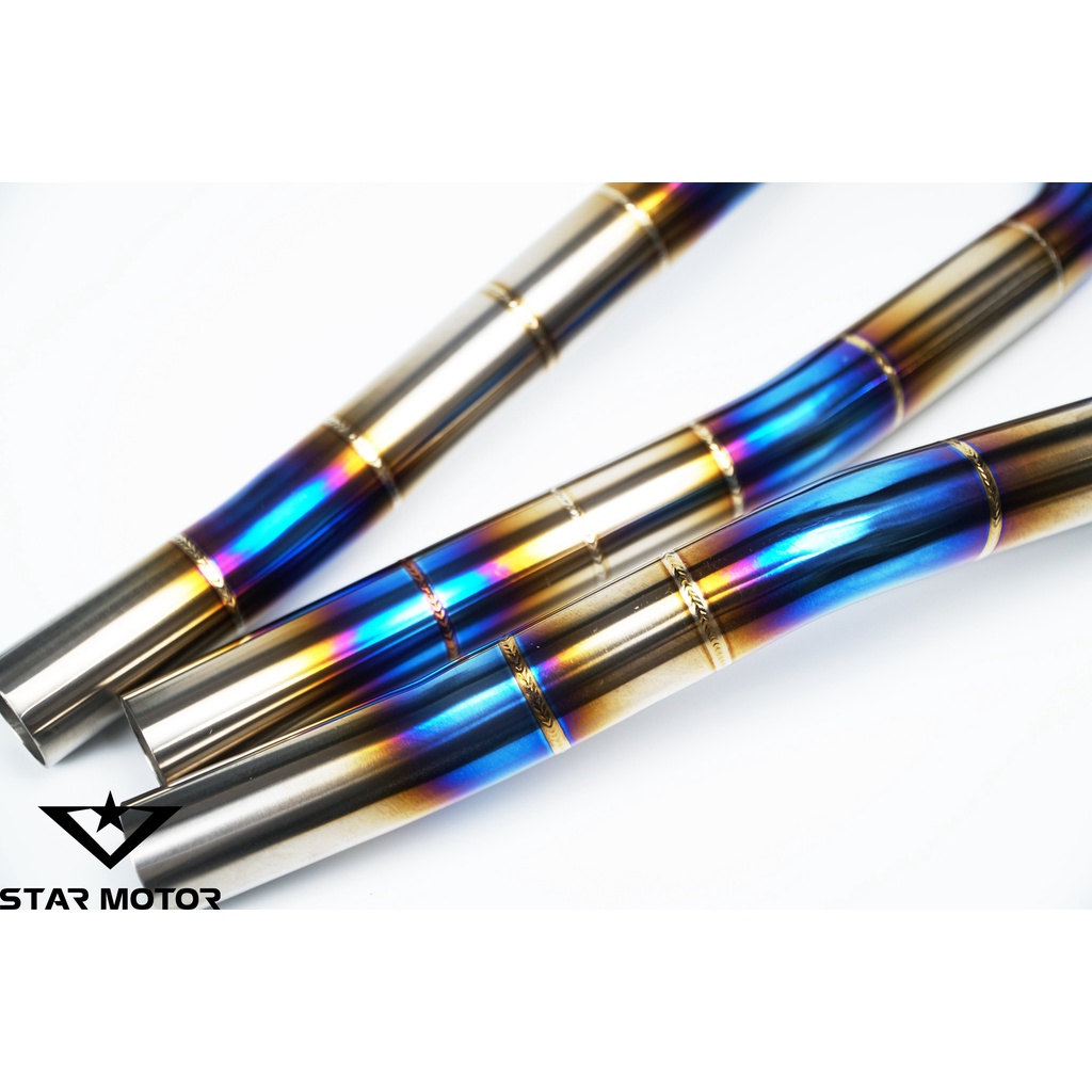 Thông tin : + Sản phẩm được sản xuất bởi STAR MOTOR + Chất liệu Titan bóng ( khắc phục tình trạng Titan bị xuống màu ) + Mối hàn mũi tên + Tai bát nhôm CNC Anode màu + Đi kèm khâu nối Inox 304 CNC + Bảo hành 6 tháng về tình trạng bị bay màu, nhạt màu + Dành cho các