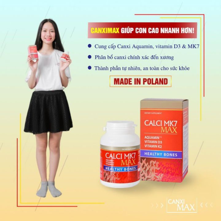 Calci MK7 Max. Canxi tảo đỏ, giúp bổ sung canxi, vitamin d3 k2 cho bà bầu, tăng chiều cao cho bé Canxi là khoáng chất trực tiếp tham gia cấu tạo xương, 99% canxi trong cơ thể tập trung ở xương. Bổ sung canxi đầy đủ sẽ giúp xương chắc khỏe, dẻo dai và nhanh dài, từ