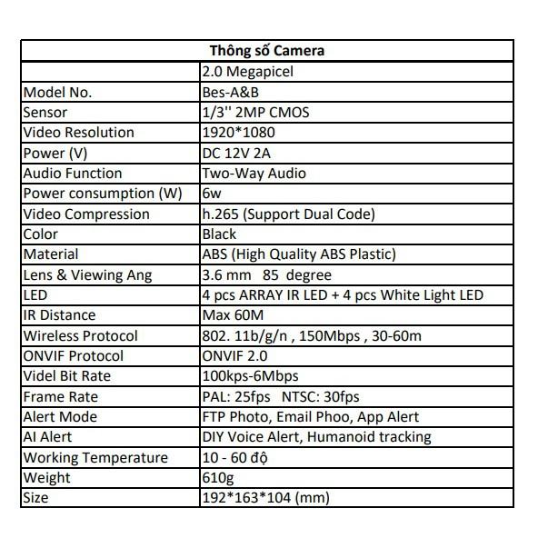 Cam kết hoàn tiền nếu sp không đúng như mô tả. Mô tả sản phẩm 1. Tầm nhìn ban đêm màu thông minh Tích hợp 4 Array IR LED và 4 LED trắng, hỗ trợ khoảng cách IR Night Vision tối đa 40 mét. 2. Phát hiện chuyển động và báo động Khi phát hiện chuyển động được kích hoạt, bạn sẽ nhận được thông báo qua điện thoại. 3. Hai Chế độ Không dây (Wifi) và Có dây Thuận tiện hơn cho việc sử dụng. Thưởng thức trò chuyện gia đình bất cứ lúc nào và bất cứ nơi nào 5. Tính năng PTZ Xoay 270 độ / Nghiêng 90 độ / Zoom kỹ thuật số 4X. 6. Hỗ trợ ứng dụng và trình duyệt Đóng gói bao gồm: 1 * Bộ đổi nguồn 1 * Hướng dẫn sử dụng 1 * Trình điều khiển vít & túi vít 1 * Nguồn cung cấp DC12V 2A Giá sản phẩm trên Tiki đã bao gồm thuế theo luật hiện hành. Bên cạnh đó, tuỳ vào loại sản phẩm, hình thức và địa chỉ giao hàng mà có thể phát sinh thêm chi phí khác như phí vận chuyển, phụ phí hàng cồng kềnh, thuế nhập khẩu (đối với đơn hàng giao từ nước ngoài có giá trị trên 1 triệu đồng).....