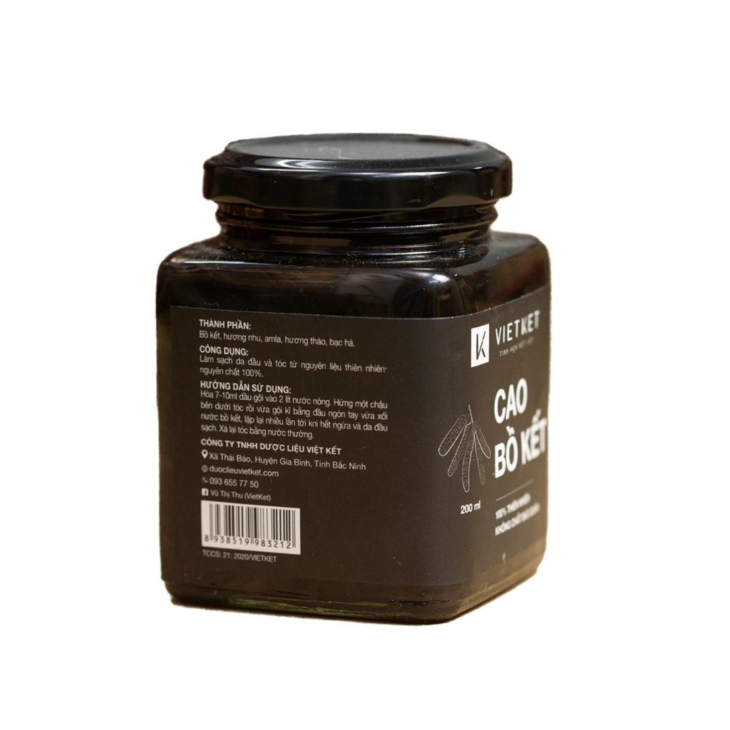 Cao Bồ Kêt Giảm Gãy Rụng Tóc, Kích Thích Mọc Tóc VIETKET 200ML (date luôn mới) 🌿ĐẶC ĐIỂM: - Cao bồ kết VietKet là quá trình hầm bồ kết, hương nhu, lá ổi, amla, mần trầu, BẠC HÀ các nguyên liệu theo mùa; rồi trải qua quá trình vắt lọc bỏ bã, cô đặc lại thành cao đảm bảo hàm lượng nước trong thành phẩm thấp nhất giúp cao để được lâu ở nhiệt độ thường mà không cần tới chất bảo quản. Cao bồ kết không sử dụng chất tạo bọt nên khi gội cần hòa ra chậu nhỏ rồi gội như ngày bé. Cao bồ kết bắt buộc gội với nước ấm nóng để làm sạch và nuôi dưỡng tóc tốt nhất. Nước cuối xả tóc bạn cho thêm quả chanh hoặc xịt hương nhu vào để xả tóc sẽ làm tóc suôn mượt hơn. 🌿CÔNG DỤNG : - Cao bồ kết VietKet chứa hoạt chất làm sạch, nuôi dưỡng mái tóc - Giúp kích thích tóc mọc, làm mượt tóc , giúp tóc chắc khỏe - Giảm gàu, giảm các triệu chứng viêm nhiễm da dầu - Giảm rụng tóc do tác động của hóa chất, do thay đổi tiết tố sau sinh - Mùi hương bồ kết tự nhiên giúp giảm đau đầu, thư giãn 🌿HƯỚNG DẪN SỬ DỤNG - Bước 1: Hòa tan 7ml cao bồ kết bằng nước nóng sau đó pha thêm 3l nước ấm nóng, - Bước 2: Sử dụng 2/3 nước bồ kết đã pha gội kỹ bằng đầu ngón tay nhiều lần giúp sạch da chêt và bụi bẩn - Bước 3: Sử dụng phần còn lại mát xa da đầu. - Bước 4: Tráng lại tóc với nước thường . 🌿LƯU Ý: - Bảo quản: nơi khô ráo thoáng mát, tránh ánh nắng trực tiếp. - Hạn sử dụng: 9 tháng từ ngày sản xuất và 3 tháng sau khi mở lắp. - Cao ở dạng cô đặc nên khi dùng cần pha với nước. - Giảm rõ rệt hiện tượng rụng tóc sau 3 tháng sử dụng