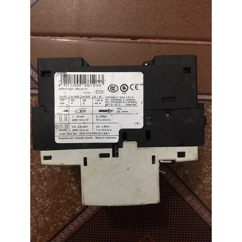 Hình thức sản phẩm như hình Sản phẩm sản xuất tại Đức Bảo vệ quá tải cho động cơ ba pha 1) Model 3RV1021 4AA10 bảo vệ động cơ ba pha 7,5kw Dòng định mức max 16A Giải điều chỉnh dòng 11A-16A Ngắt ngắn mạch là 208A Dòng ngắn mạch tại 400VAC là 50KA 2) Model 3RV1021-4DA1