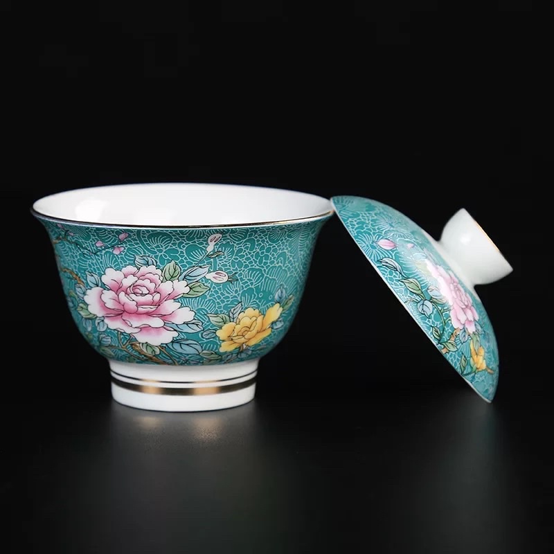 Chén Khải Hoạ Tiết Hoa Mẫu Đơn Viền Vàng Cốt sứ tốt thấu quang