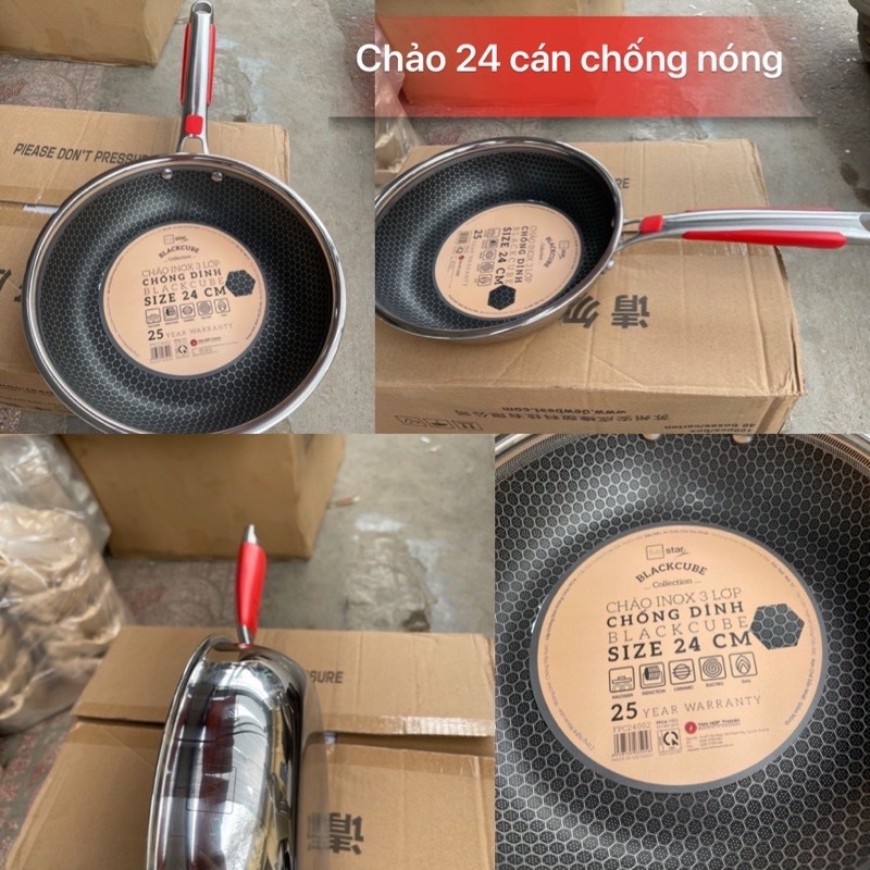 √ LƯU Ý: DO THIẾT KẾ TAY CẦM BẰNG KIM LOẠI NÊN CÓ THỂ BỊ NÓNG KHI NẤU BẰNG BẾP GAS. Chảo chống dính cao cấp BLACKCUBE FIVESTAR 3 lớp đáy liền inox siêu bền , chống trầy xước. Công nghệ BLACKCUBE chống trầy xước, siêu bền KỸ thuật khoan khắc tạo ra các khối inox siêu nhỏ hình tổ ong giúp bảo vệ lớp chống dính bên dưới Tối ưu hóa khả năng chống trầy xước lớp chống dính , nên khó bong tróc Đặc biệt lớp chống dính không chứa PFOA an toàn sức khỏe người dùng. Cấu tạo lớp lớp inox 304- nhôm -inox 430 tiết kiệm nhiên liệu giúp hấp thu nhanh , tỏa nhiệt đều Sử dụng tất cả các loại bếp như bếp từ , hồng ngoại , gas. Dòng chảo kết cấu này rất được các đầu bếp tin dùng, chảo có cách sử dụng riêng được hướng dẫn rất kỹ trong ảnh 5 phần ảnh sản phẩm ạ. #chaoinox #fivestar #chaochongdinh #chaoblackcube #chaocaocap #inox #fivestarchinhhang