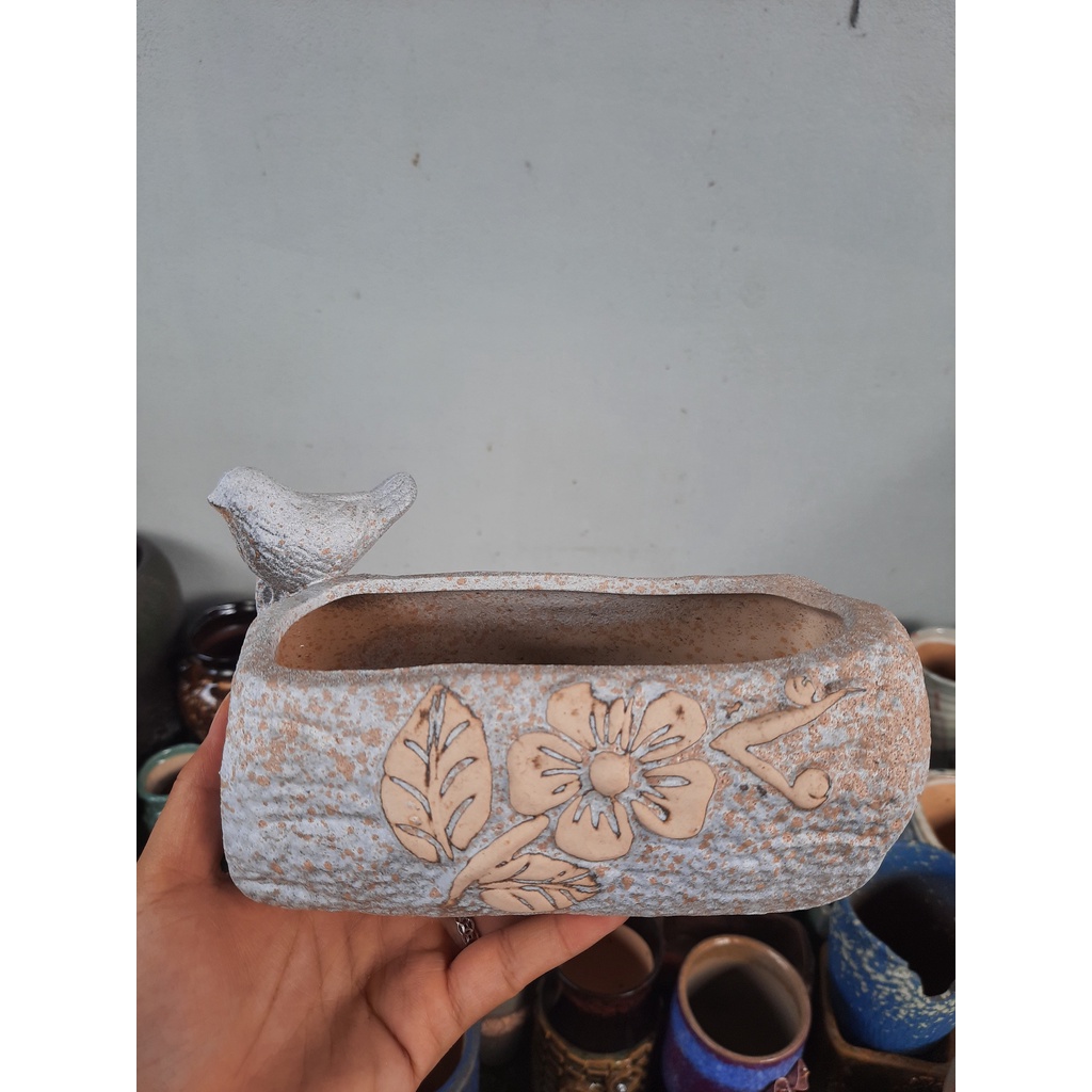 Chậu kiểu xinh xắn hình khúc gỗ chim đậu trồng sen đá. Kích thước cao 7cm x miệng rộng 16cm