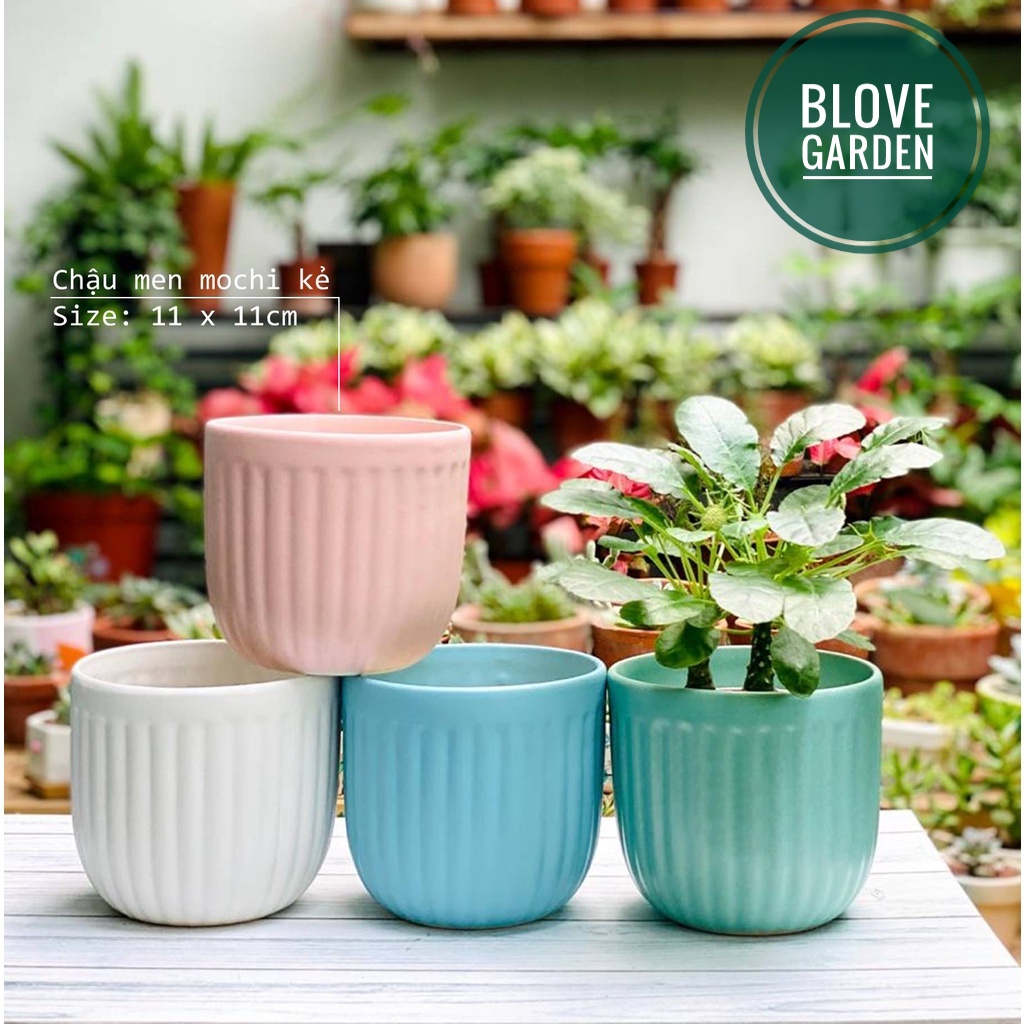 Chậu Mochi kẻ sọc, Hai size 11x11 Và 14x15cm chậu trồng cây gốm tráng men 3 màu đẹp