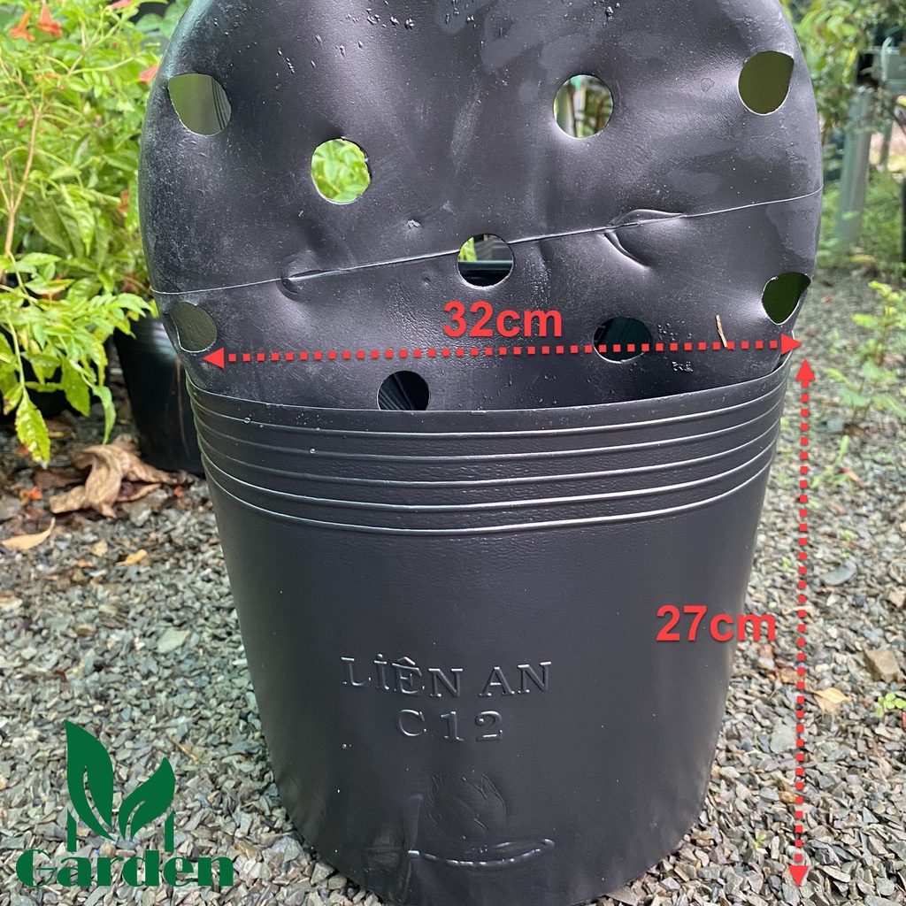 CHẬU NHỰA ĐEN C12 Kích thước : - Đường kính mặt chậu : 32cm - Chiều cao : 27cm 👉 Chậu nhựa ươm cây được sản xuất từ nguyên liệu nhựa HDPE đen bóng đẹp dai. 👉 Chậu nhựa Liên An có độ bóng đẹp, cầm nhẹ tay, mềm và có độ dày và đặc biệt dai. 👉Độ bền cao, ch