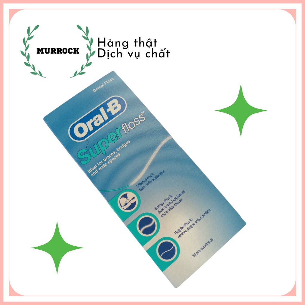Oral-B Super Floss, 50 sợi cắt sẵn, hương bạc hà - Oral-B Super Floss là sản phẩm lý tưởng để làm sạch mắc cài, cầu răng và khoảng trống rộng giữa các răng. Ba thành phần độc đáo của nó - một sợi chỉ nha khoa có đầu cứng, chỉ nha khoa xốp và chỉ nha khoa thông thường
