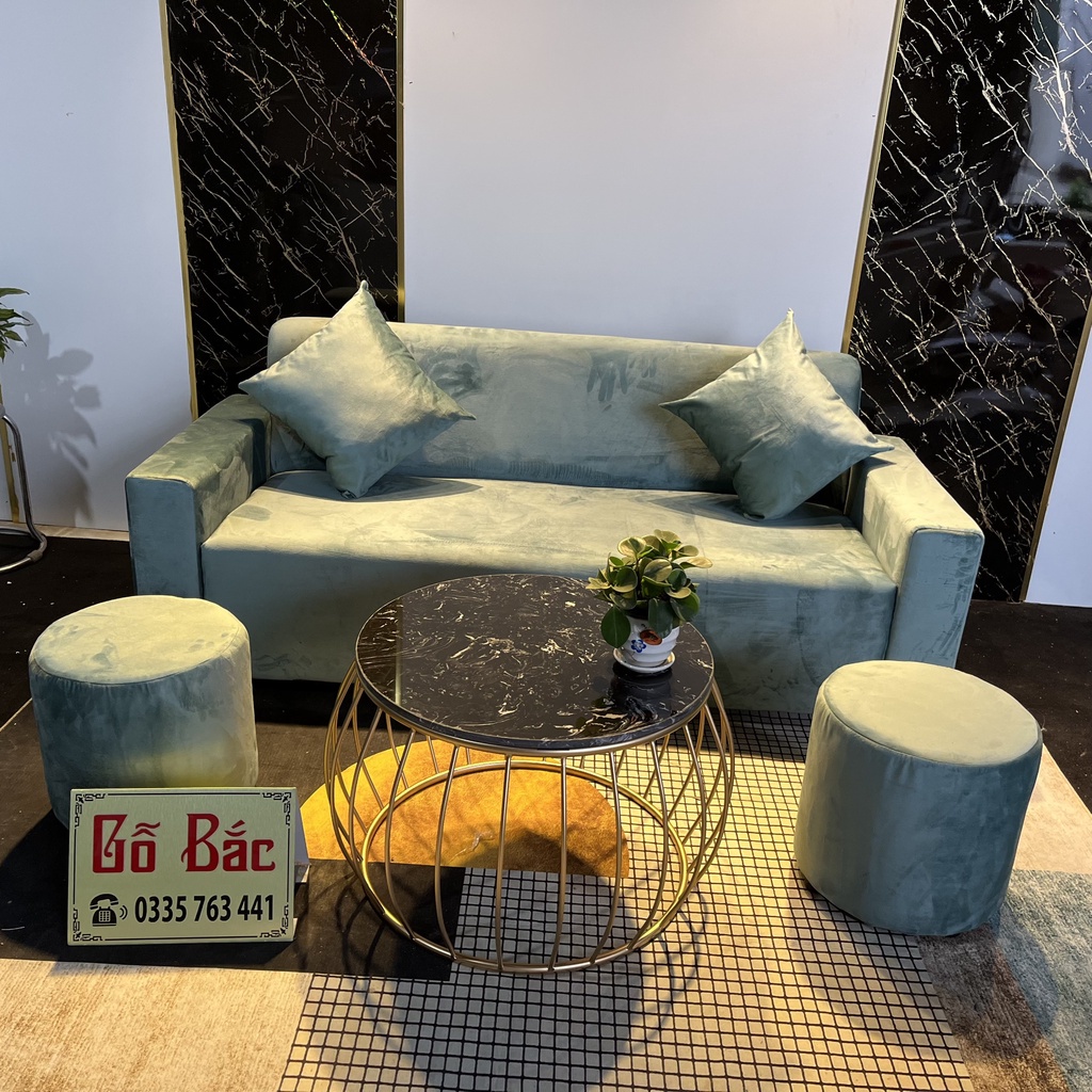 Chọn bộ ghế sofa khung gỗ tự nhiên bọc nỉ nhung màu sắc tùy chọn, có kèm bàn trà trắng tròn chân gỗ