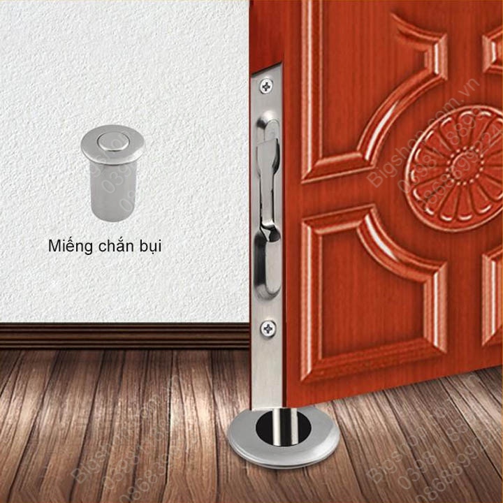 Thiết kế thông minh, sáng tạo, chắc chắn Chuyên lắp âm cửa gỗ, dùng chốt cố định cánh cửa Vật liệu inox 304 dày 1.0mm nên rất chắc chắn và bền, kích thước dài 6 inch (152mm) Chặn cắt âm sàn thiết kế với hệ thống lò xo giúp tự bịt lỗ chống cát, bụi rơi xuống khi mở cửa