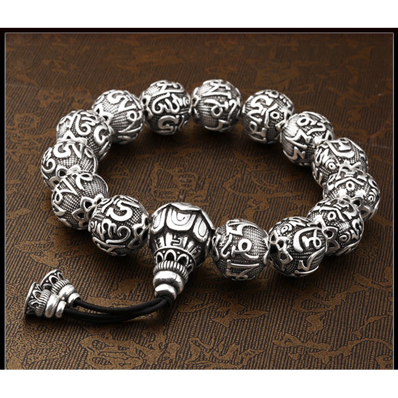 Chuỗi hạt đeo tay khắc chú kèm hồ lô hoa sen mạ bạc thái cao cấp